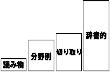 英語の参考書を、「読み物」「分野別」「切り取り」「辞書的」の4つに分類
